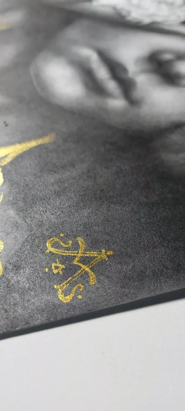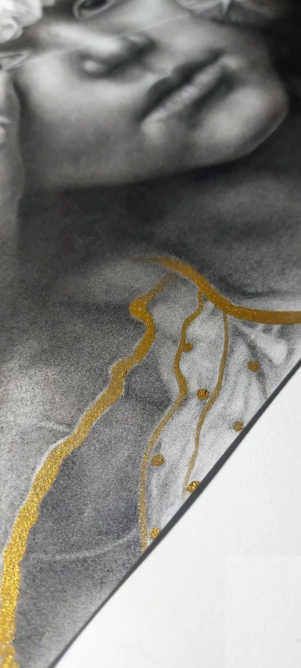 Medium: Graphite, white charcoal and metallic ink on paper.